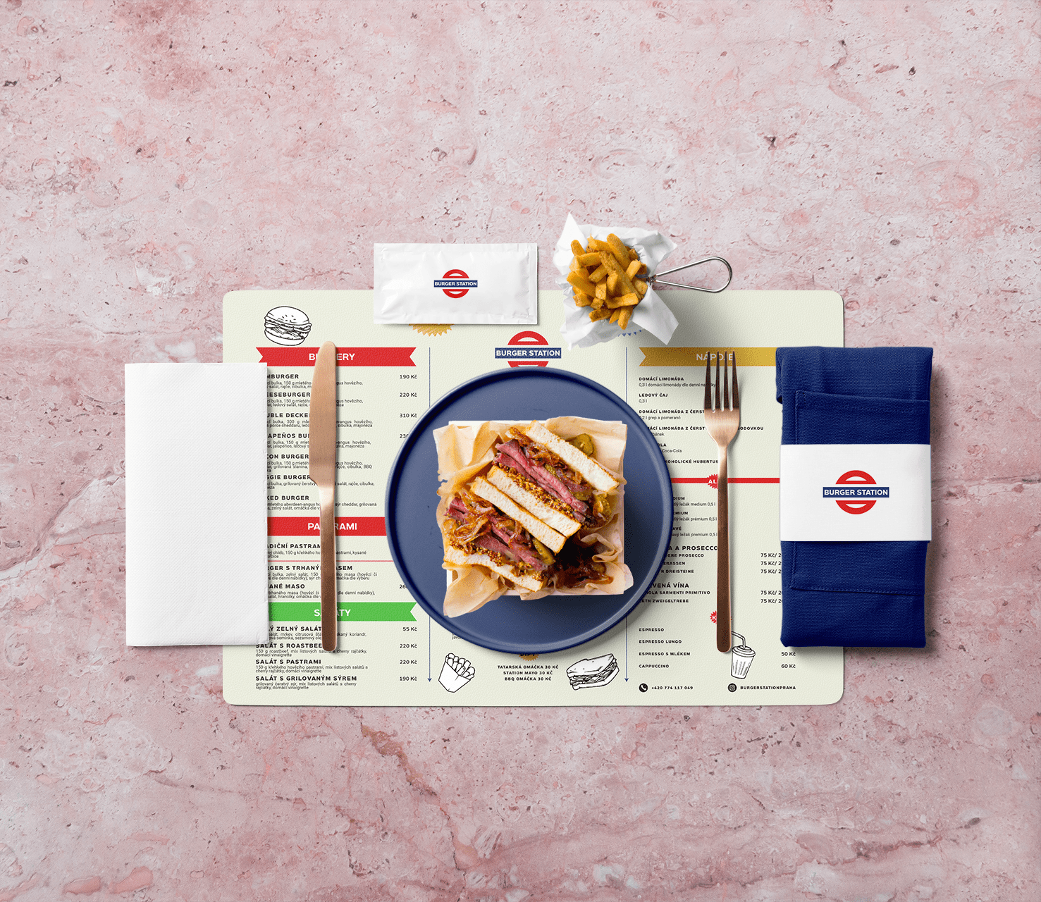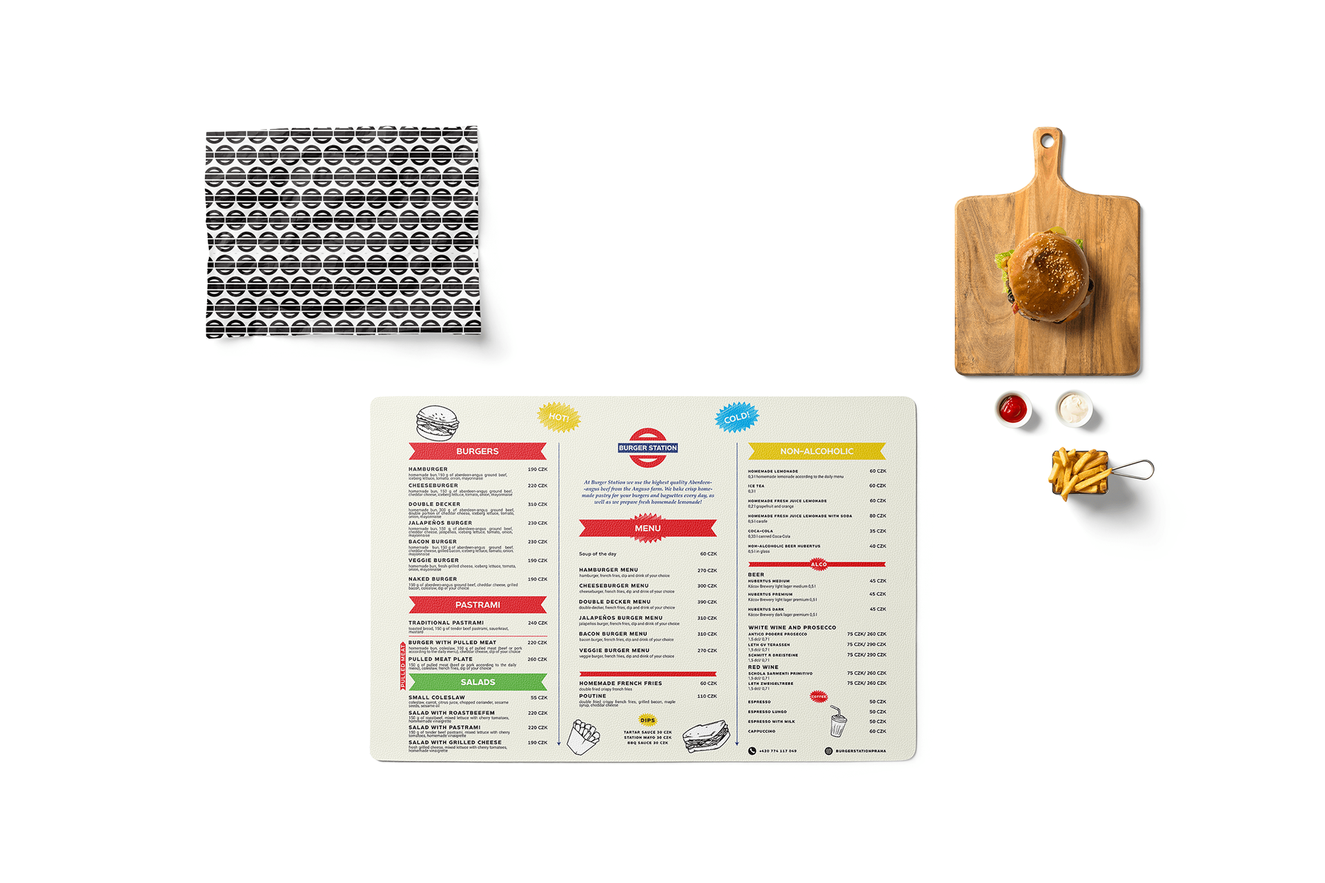 Burger Station is a new burger and pastrami restaurant in Prague district Nusle. It’s a place where you can find the highest quality Aberdeen-Angus beef, homemade buns, and homemade lemonade. I was commissioned to design a visual identity, and web design.